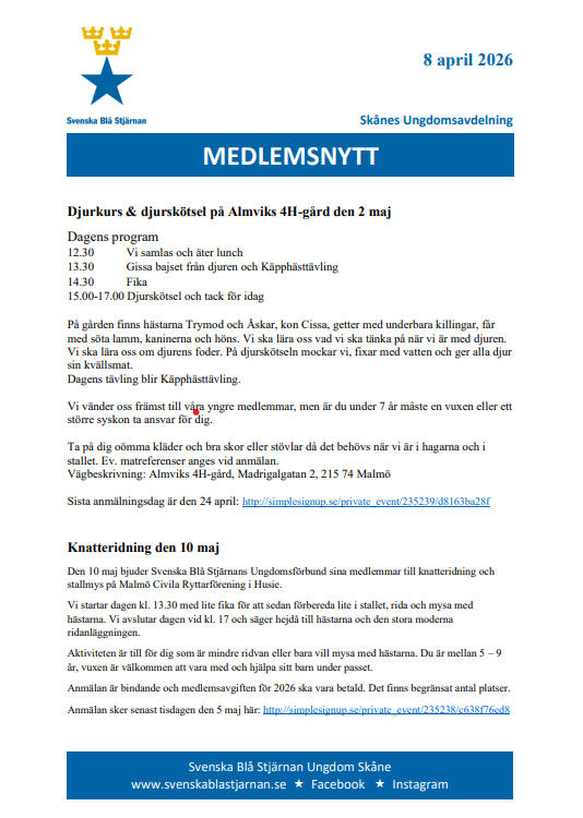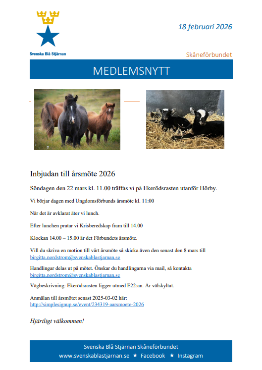 Vi har även blivit mycket digitala. Vi finns på Facebook, (Svenska Blå Stjärnan Skåne, Svenska Blå Stjärnan Ungdom Skåne) och Instagram Svenska Blå Stjärnan Skåneförbundet). Även på SBS hemsida under Skåne ska nu finnas aktuell information. Så om ni kollar där så kommer det upp aktuell där. Vi ska även försöka skicka ut ett digitalt brev en gång i månaden med nyheter.